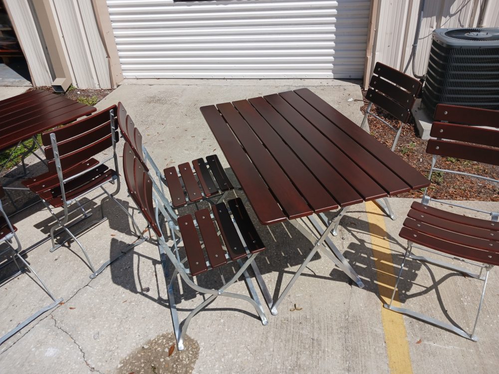 The chairs have dark walnut wood slats and silver galvanized frames and the tables has dark walnut wood slats and hot dipped galvanized frames